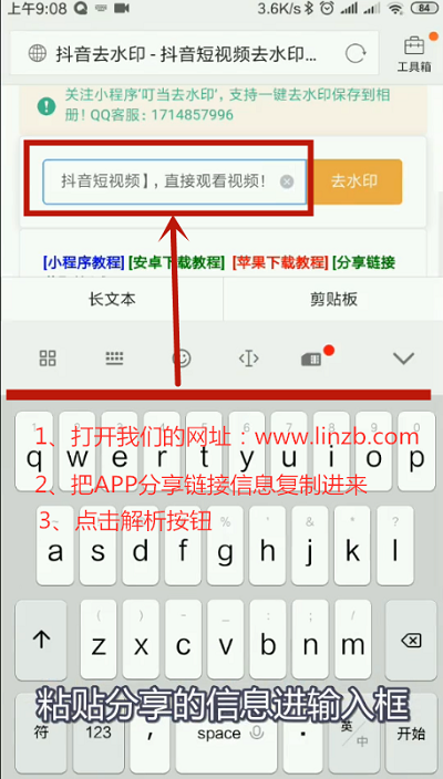 四、把在抖音上复制的链接粘贴到输入框里,然后点击 “ 解析 ” 按钮