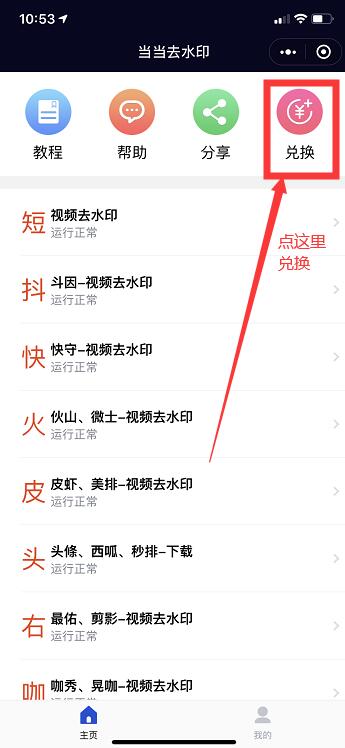 二、打开当当去水印小程序后,点底部第三个菜单“我的”=>“在线兑换”,输入激活码或账号进行绑定操作。